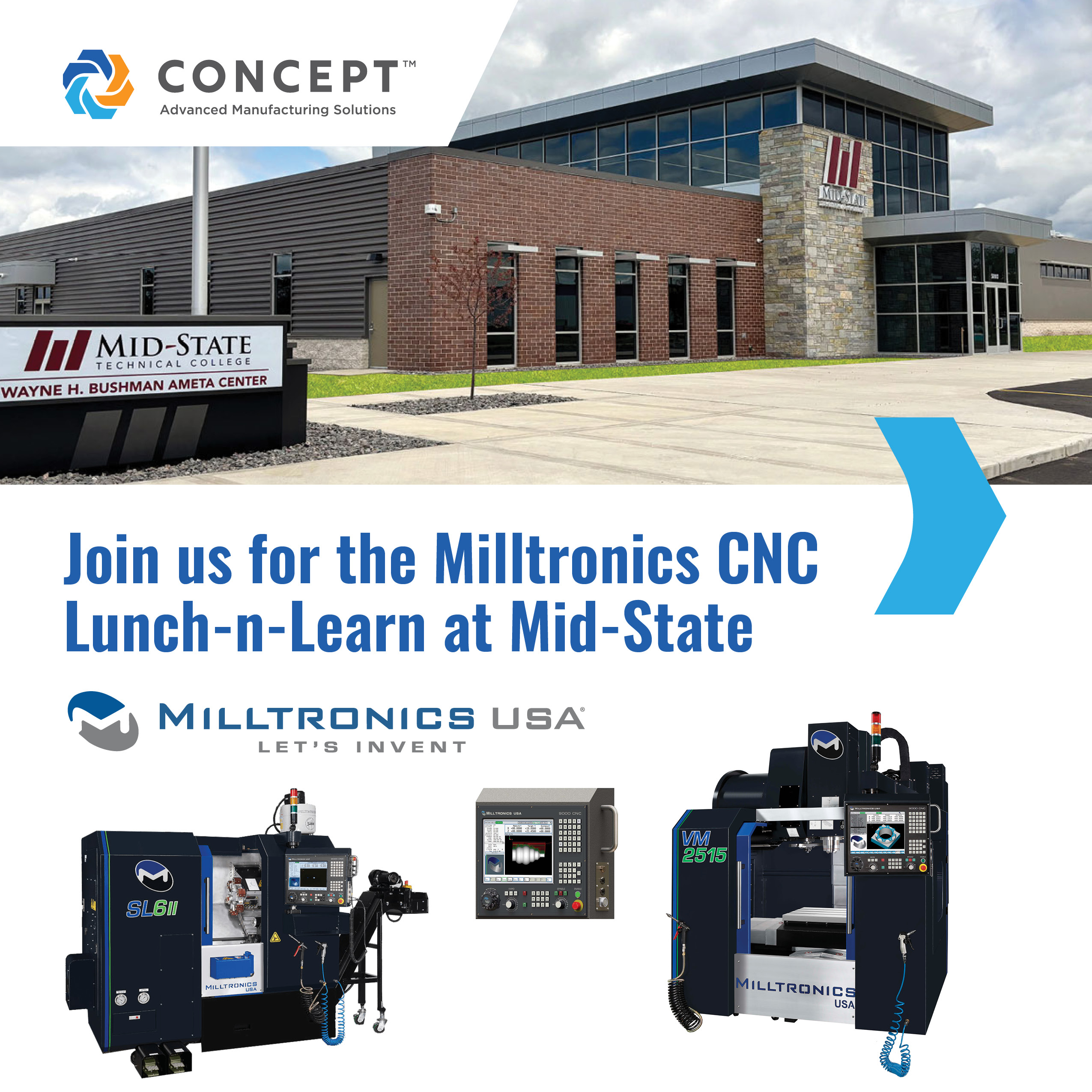 Concept Wisconsin 407 Austin Circle, Delafield, WI, United StatesMid-State Technical College in Stevens Point, WI, is hosting a Milltronics CNC Lunch-n-Learn on Friday, December 6, 2024 from 11:00 AM - 2:00 PM. Key highlights: Milltronics Conversational Programming techniques Offline CAM software and benefits Live machine demo's and advanced application techniques Complimentary lunch served from 11:00 AM - 12:00 PM Location: Mid-State Technical College,…